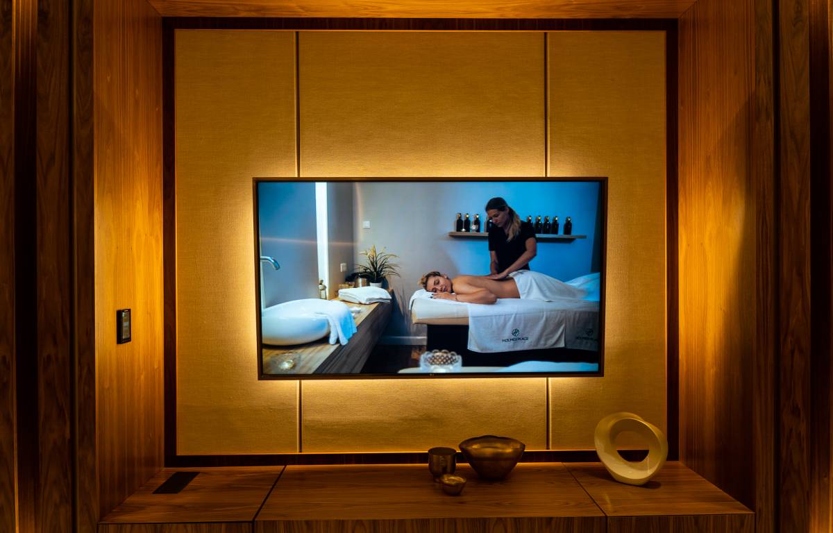 I tillegg ble det implementert automatiske scenarier for belysning og visuelle harmonogrammer, samt integrasjon med hotellmusikk. I auditoriet ble det installert en Sony-laserprojektor, en projektorskjerm og Crestron-takmontert lyd. På gangen ble det plassert en 75-tommers skjerm for presentasjon av innhold, samt en kontrollpanel og takmontert lyd.