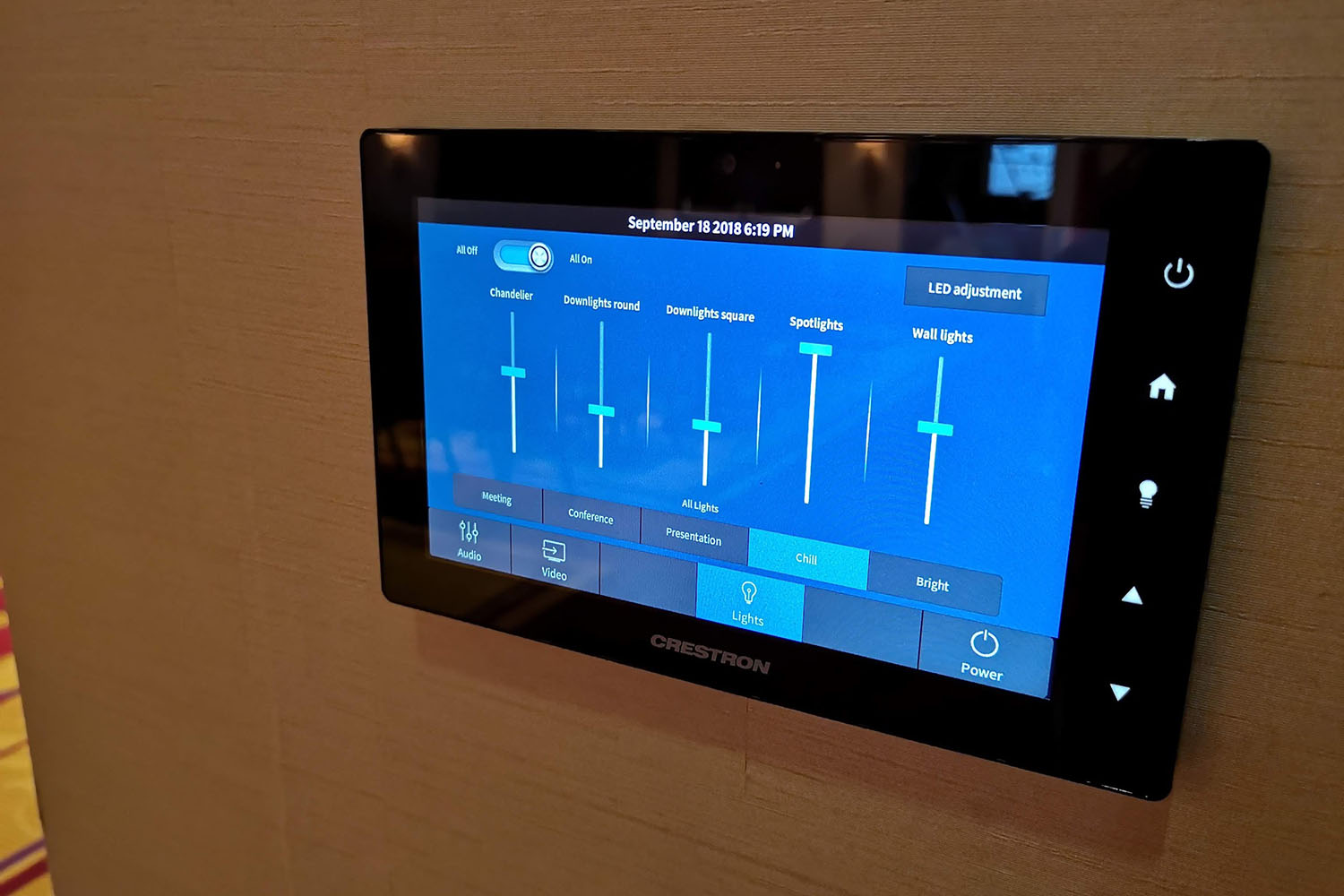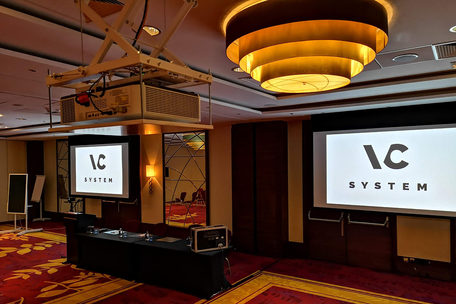 Vi satset på et avansert Crestron audiovisuelt system, som gir automatisk mediehåndtering uavhengig av romlayout. Vi installerte løsningselementer og integrerte alle enhetene som brukes i rommet: laserprojektorer, lys, klimaanlegg og lydsystem. Vi sørget for muligheten til å oppskalere mottatt Full HD-signal til 4K. I tillegg utstyrte vi hotellet med interaktive Samsung Flip-tavler, som effektivt støtter teamarbeid og øker deltakernes engasjement i møtet.
